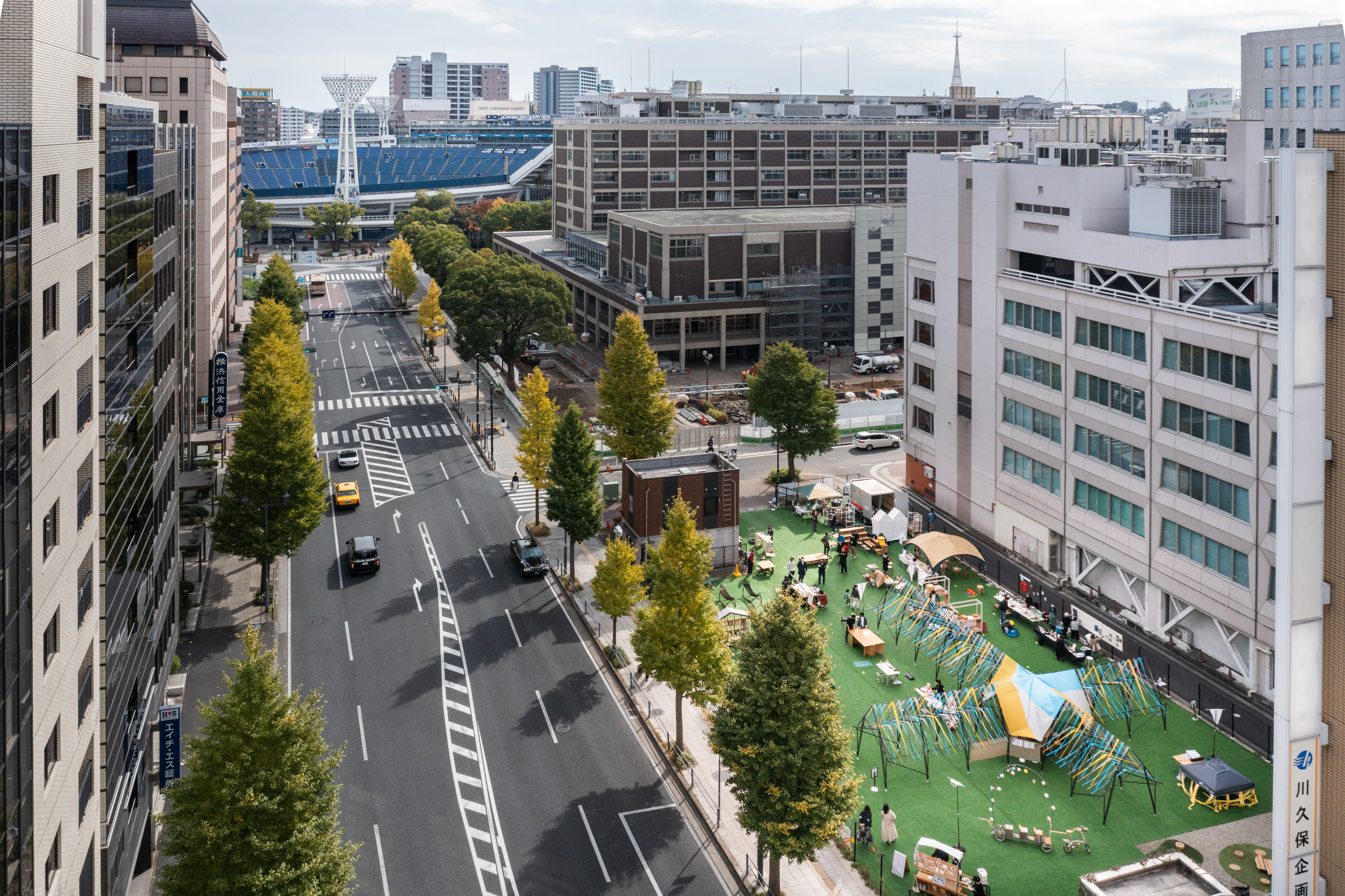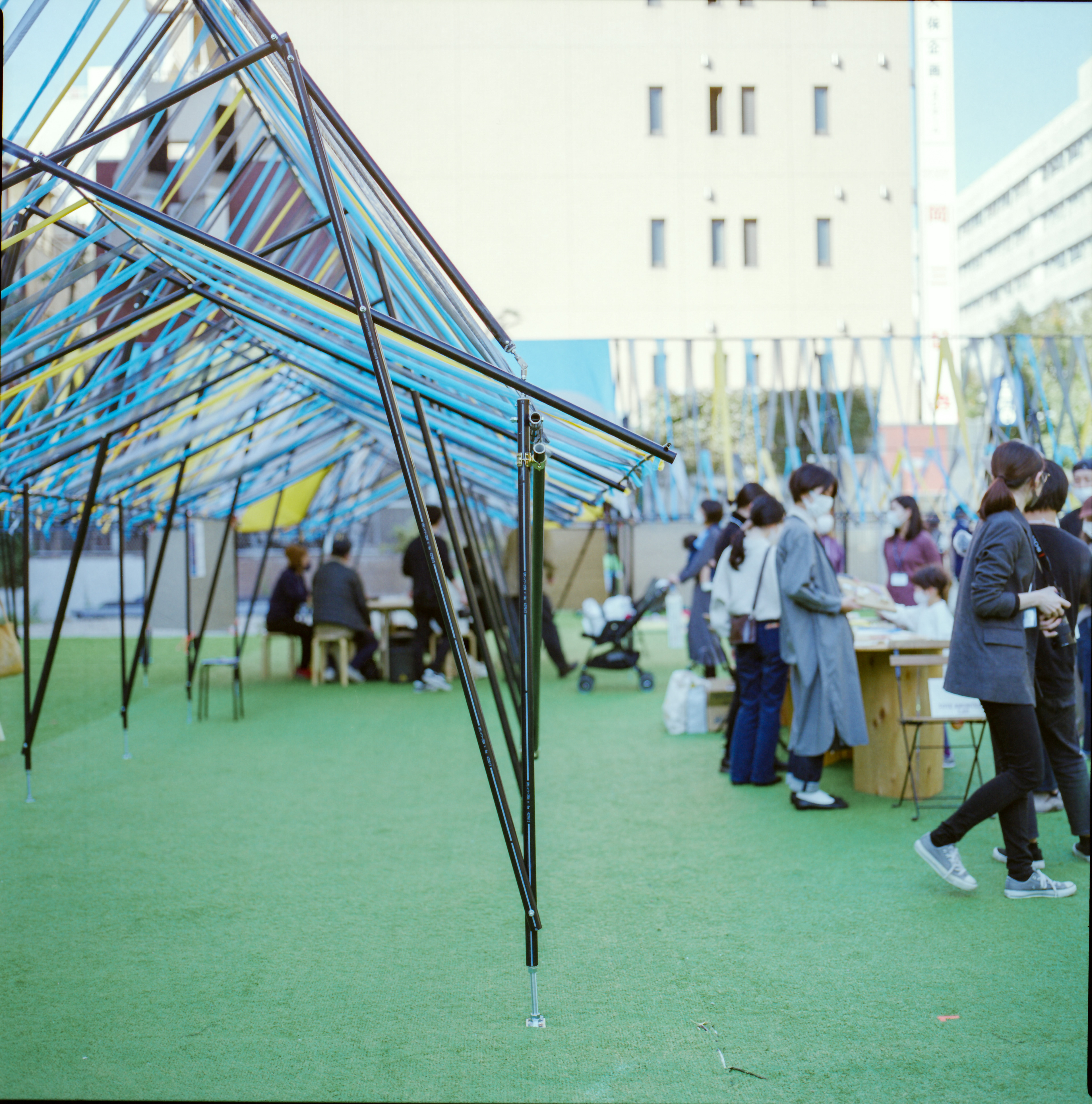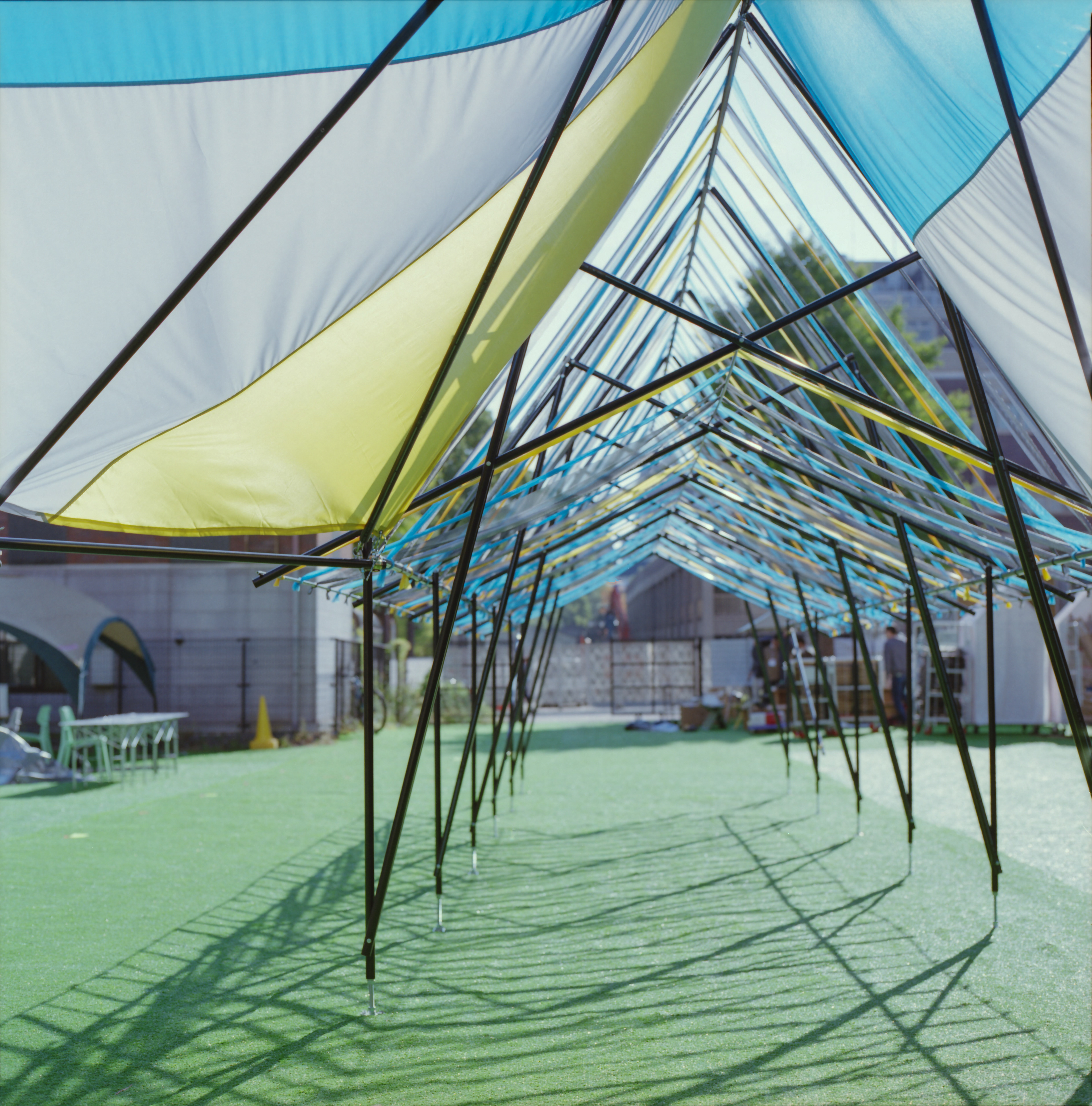 横浜のクリエイターが公共空間活用をしながら、活動を発信していくイベントで過去13回の歴史があり、これまでもこれからその敷地と形を変えていくことが予想された。そんなパヴィリオンをデザインするにあたり、素材としてもシステムとしても強度の確かなものを作るべきだと考え、FRP パイプを主体としたフレームをデザインした。このフレームは簡単な工具で組み立てられ、それらを組み合わせることにより様々な形とあり方を変えられる。時には小さなテントのように人のささやかな活動を支え、時には大きな教会堂のように広場と居場所を作ることができる。