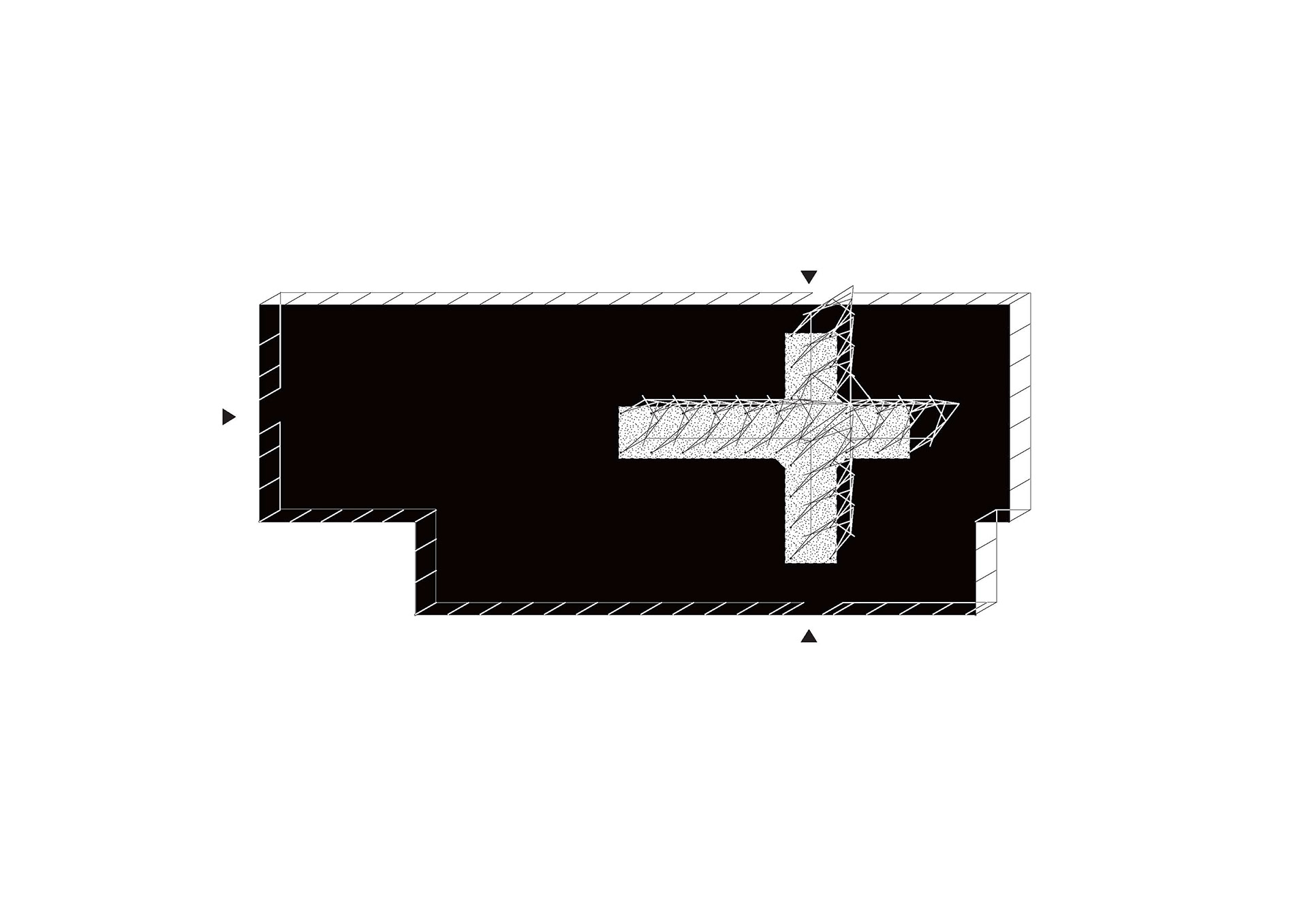 今回の敷地では、強いグリッドを持った関内の街路を受け止め4つの性質の違う広場を作り出すためのカタチでもあり、西洋の古典的で強い骨格を持った公共空間にふさわしいカタチでもある「バシリカ式平面」を採用した。