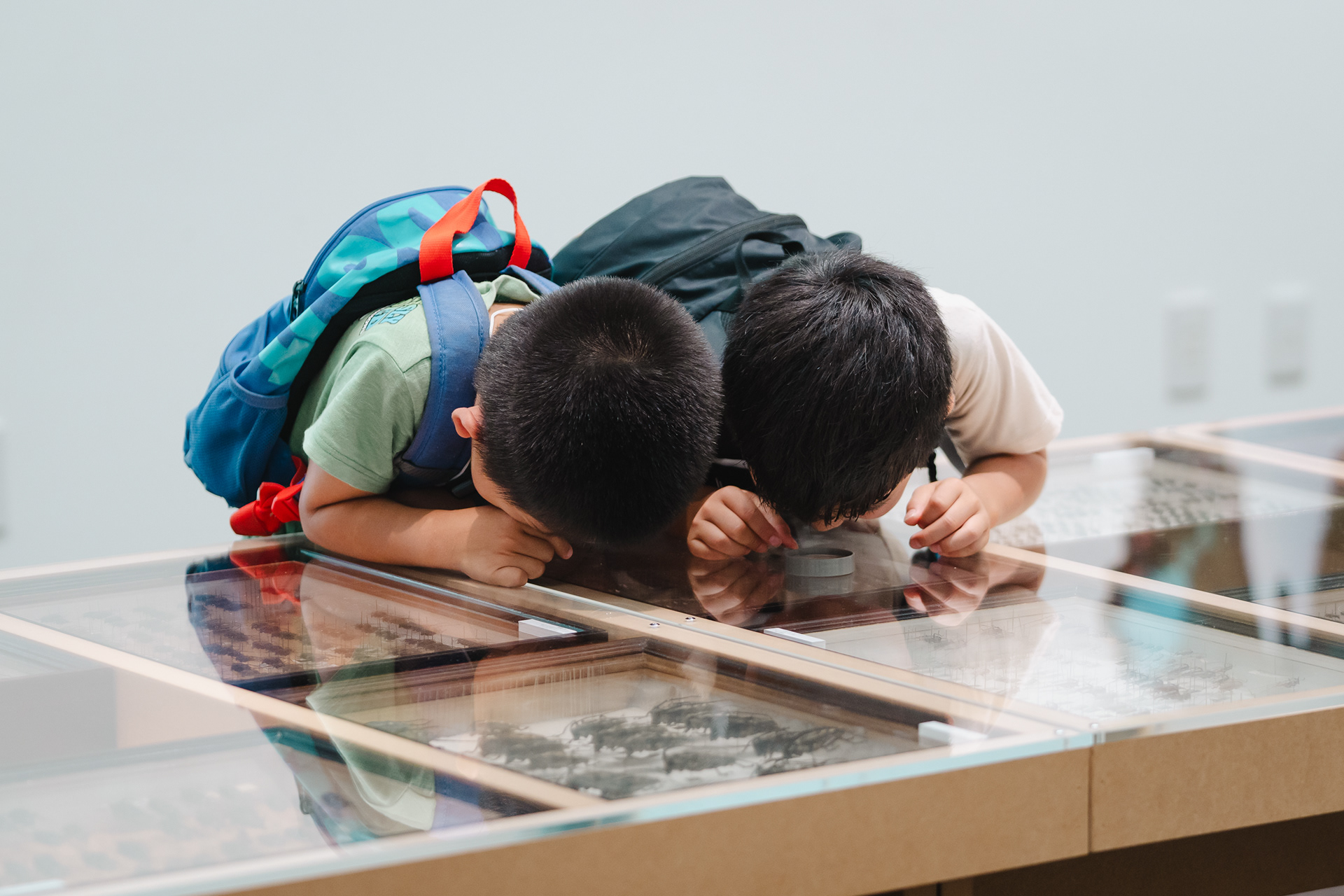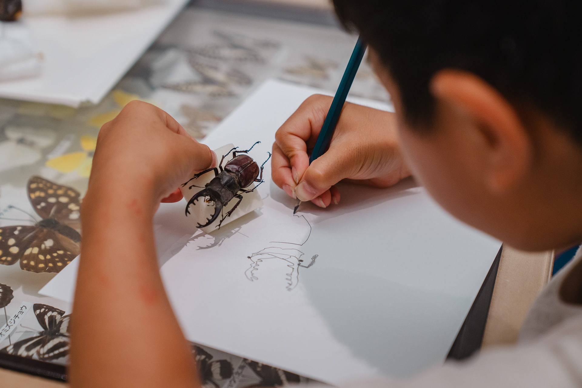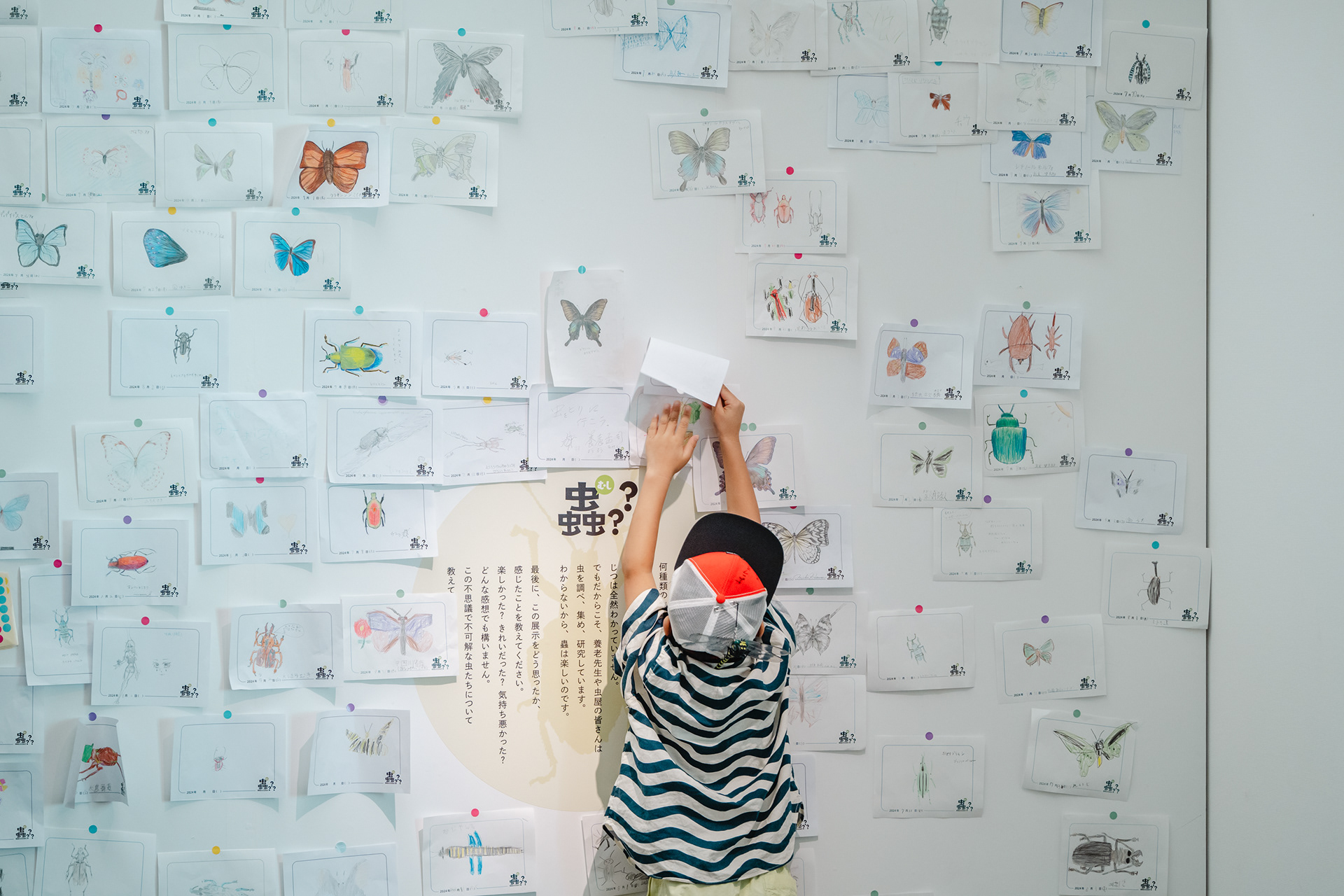 解剖学者の養老孟司の主催による本展は、「蟲」を題材にして、観ることで興味を広げたり、新しい視点を発⾒をしたりする⾯⽩さを伝え、⼦供たちの物事の観⽅を豊かにすることを目指している。そこで美術館で先生と一緒に「研究する」ような展示空間を設計した。