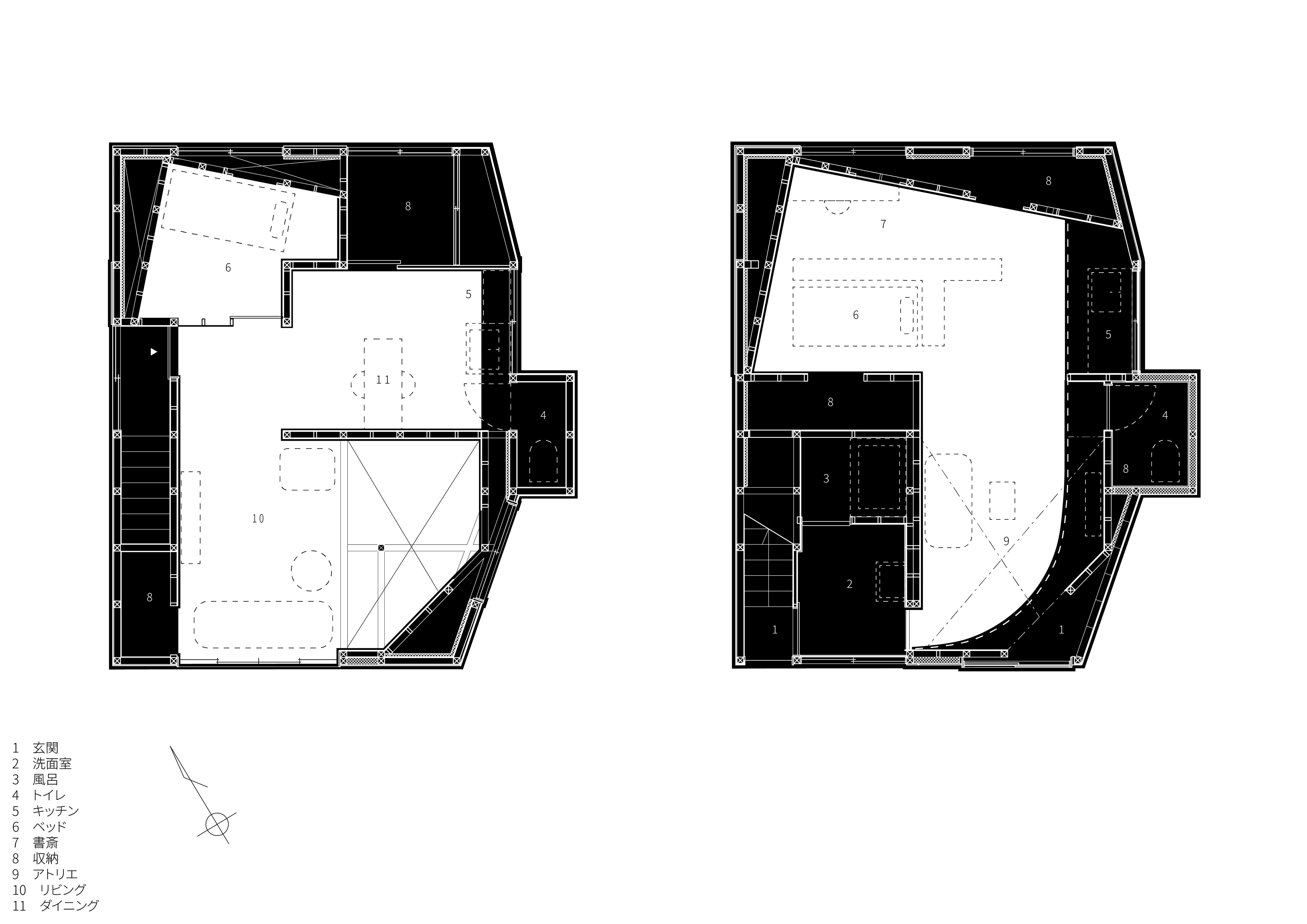 密集して建つ築50年の住宅は、度重なる分筆の過程で、未接道の再建築不可物件になっていた。1階は一部鉄骨梁を使った6M スパンの大きなワンルームで、2階には住居部分にはトイレがあるが風呂がなく、家としては不完全な状態だった。屋根につながる不要の階段がある事や構造体が劣化して補強が必要な事、そのような様々な問題がまるで木屑の様に山積していた。